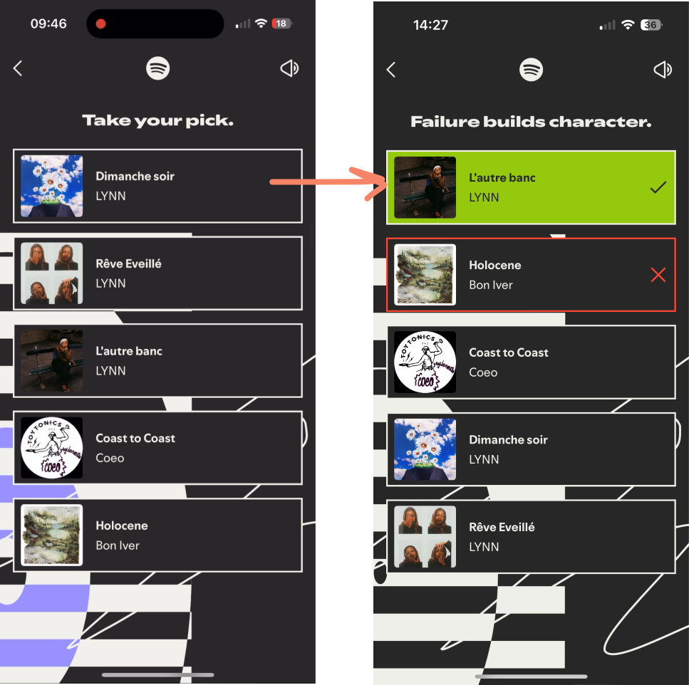 I actually missed this the first time, but when I went back to my top song, it turns out it is a live quiz. I selected one and was met with a red cross told: failure builds character.