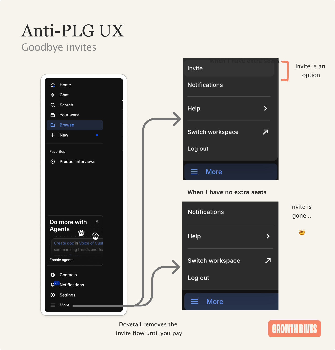Dovetail does neither. If you haven’t paid for a seat, the invite button vanishes.