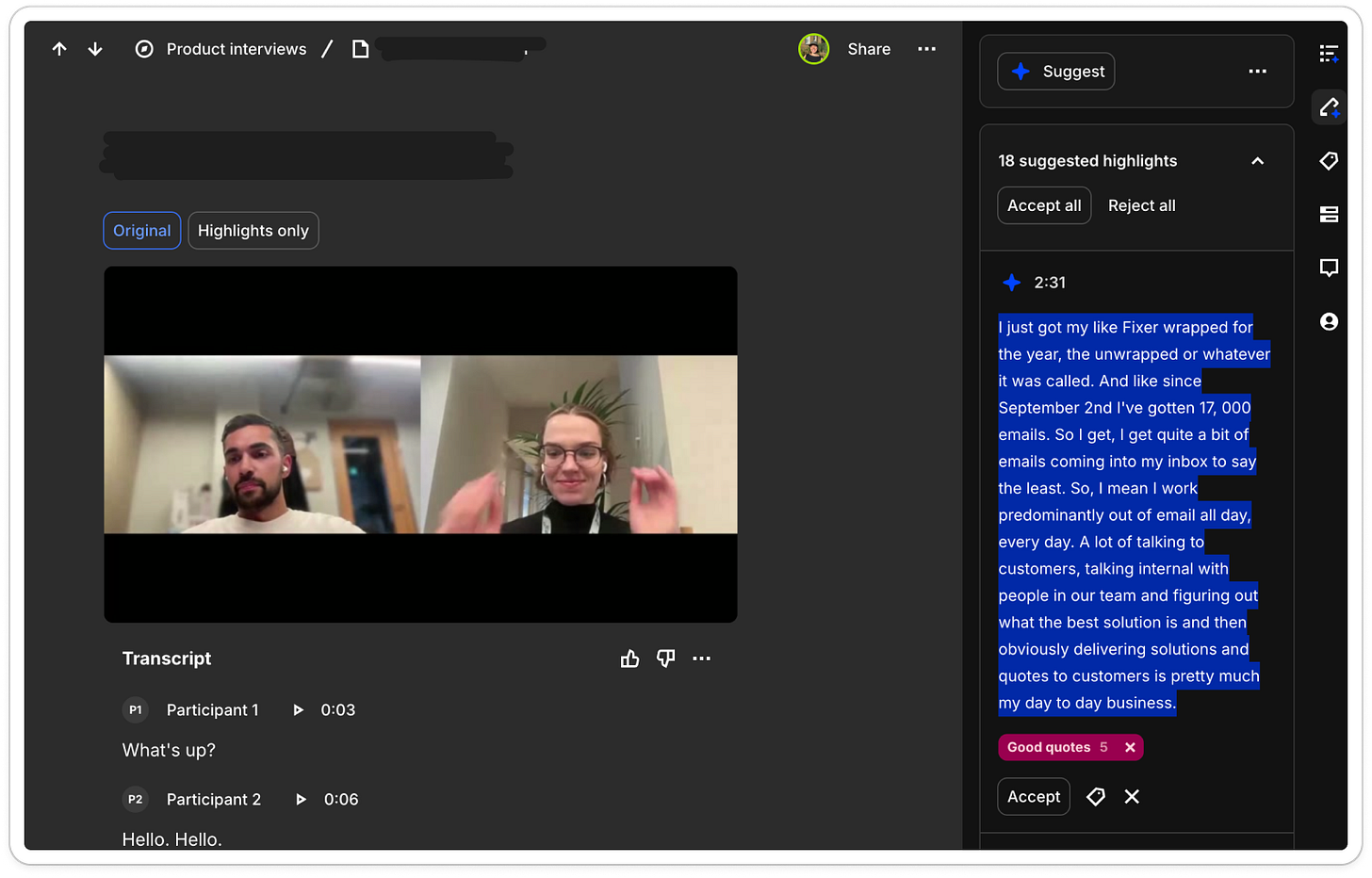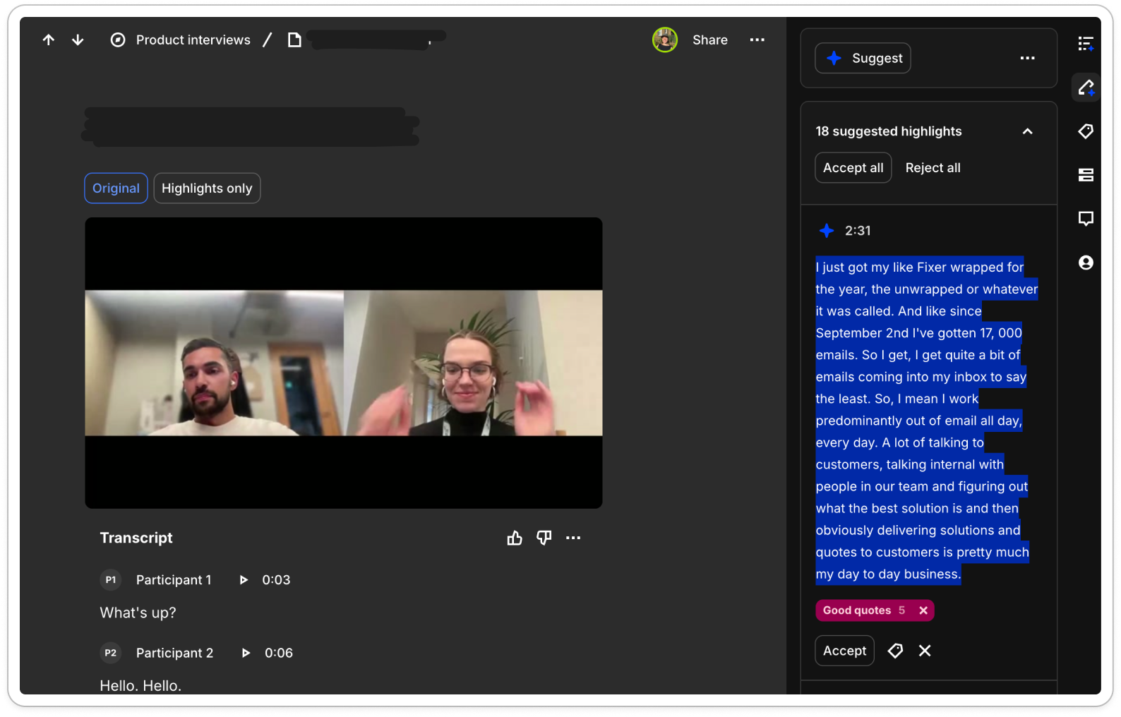 On the next interview, Dovetail reused those tags automatically. I just scanned through and accepted or declined them.