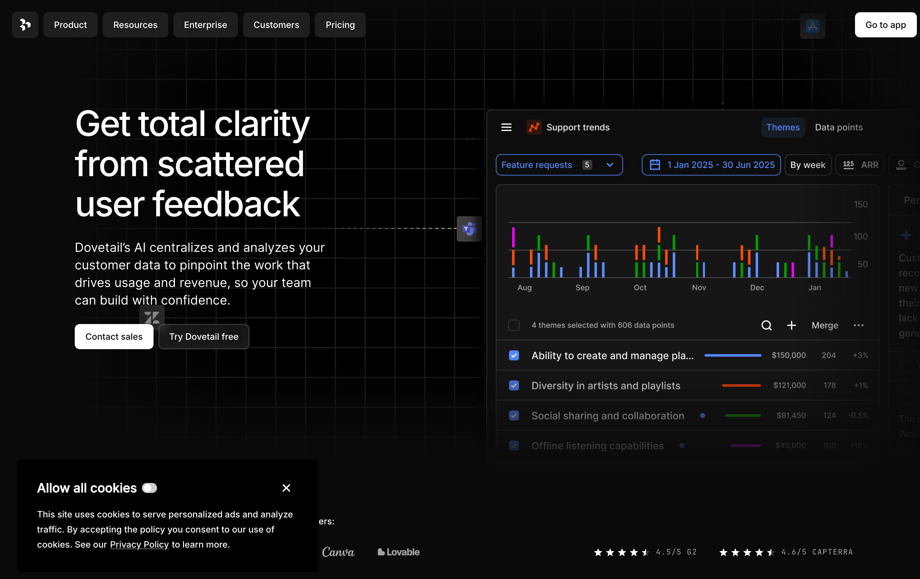 Now, the tool has 100,000 users across 4,000 brands including the likes of Netflix, Shopify, and Canva (their customers page is bursting with logos.) On their site, Dovetail claims to