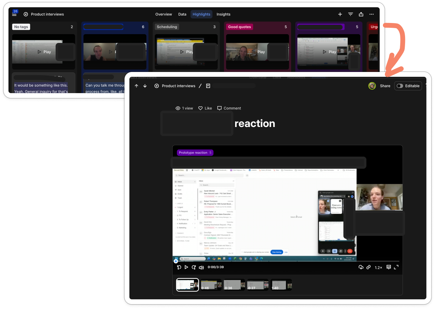 Each tag generates its own highlight reel, pulling together all the relevant quotes into a single video of customer snippets. You just paste the link and share it with the team.