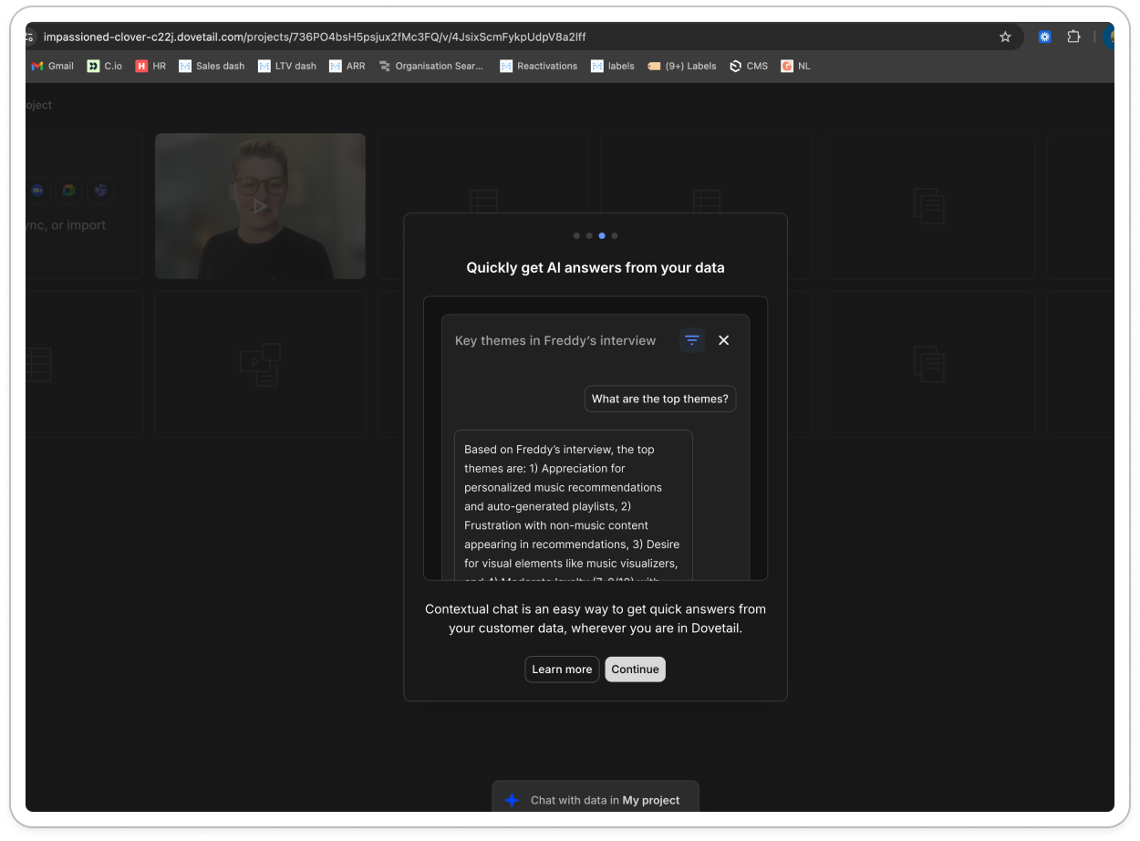 On top of that, the AI chat lets me query anything across interviews, or zoom into one, and turn it into a full-page written and video insight with a click.