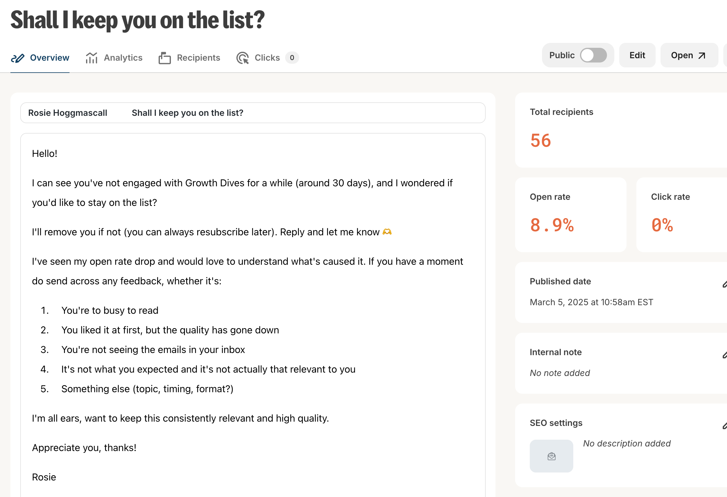 I’d rather keep the list smaller and highly engaged than inflated with inactive readers. That probably means saying goodbye to the 2,000 subscriber mark for now, but hello to healthier open rates.