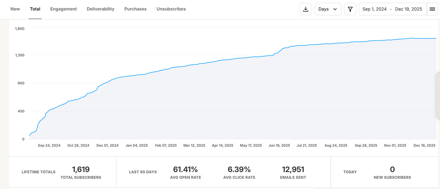 I saw wild growth in the first three months of this newsletter, getting to 1000 subscribers in 100 days since launch. 2025 has grown steadily after that (with one big bump in Jan).