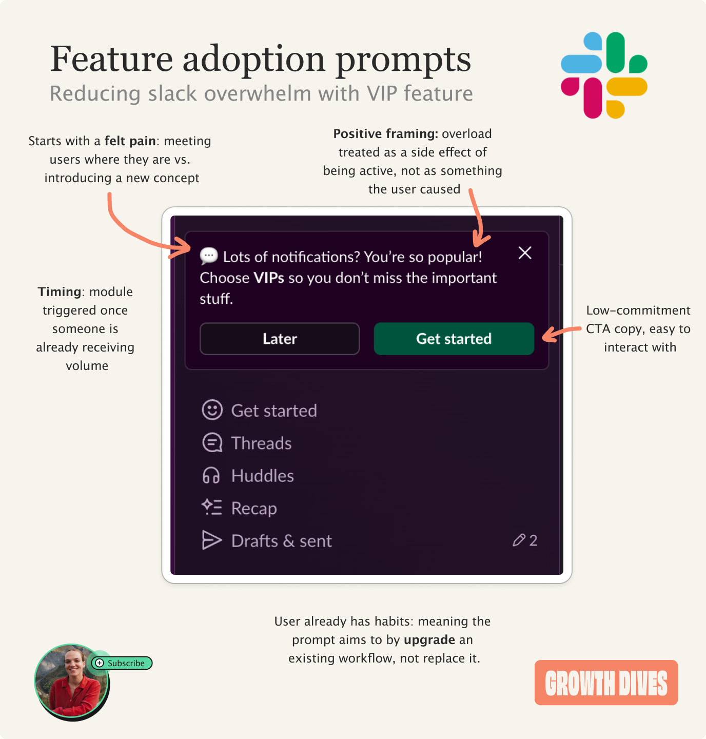 If you’re designing for feature adoption, here’s six things to try from the Slack example: