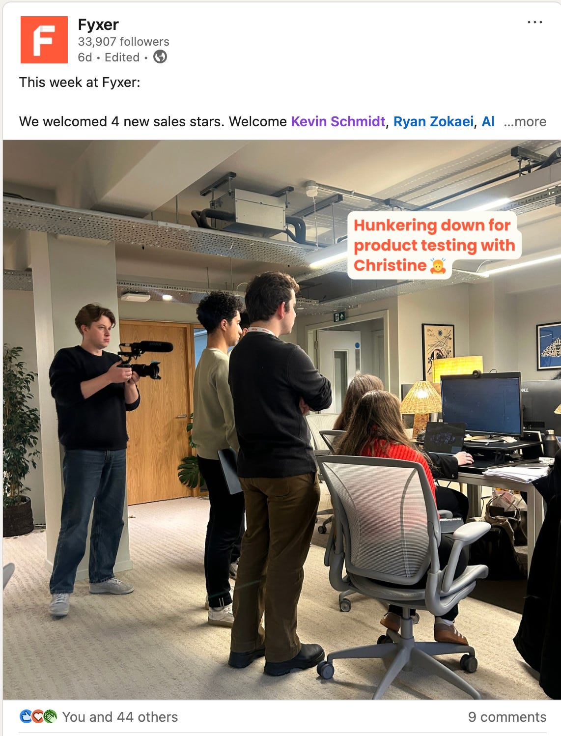 For Fyxer, that means eight or so product engineers gather in our biggest meeting room to watch a recording of someone’s screen as they work, sometimes with snacks 🍿 Our product marketing manager sourced recordings from the team and customers, so we have MP4s ready to play.