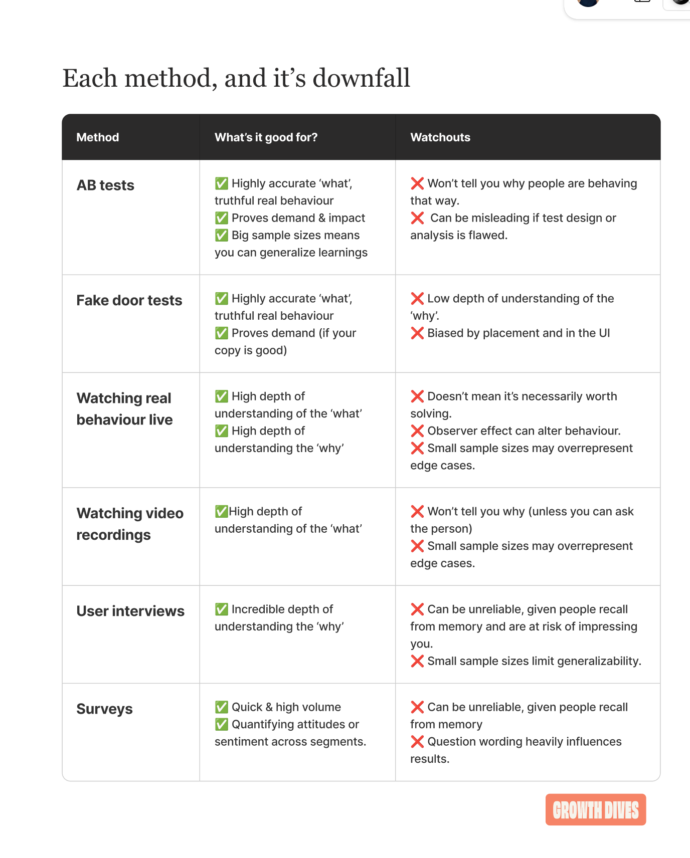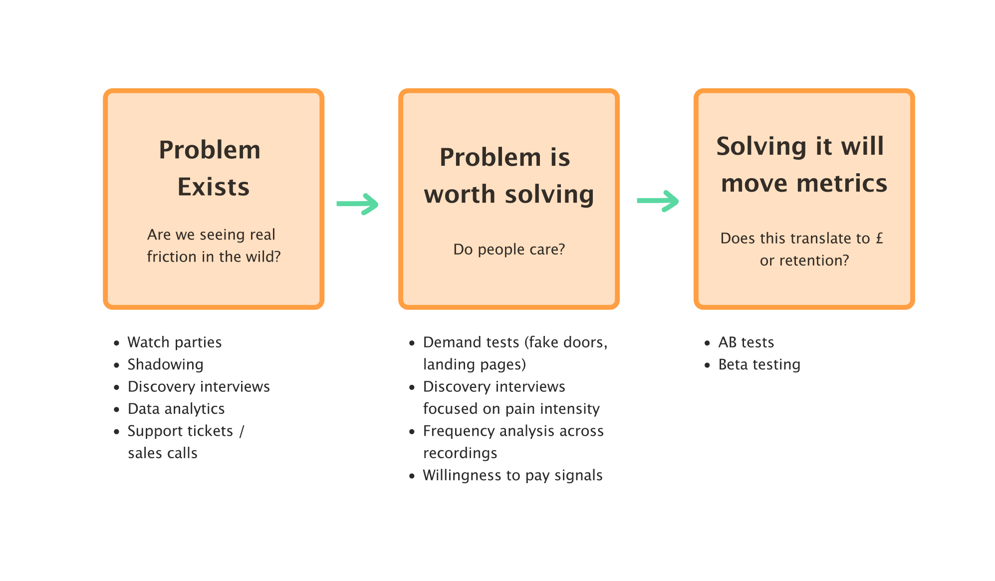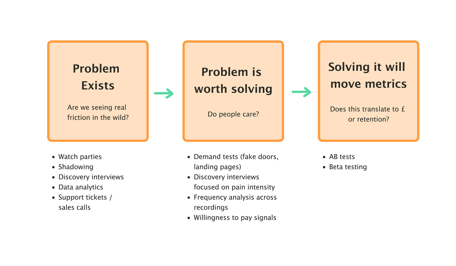 They’re for identifying new problems to solve, or ways that your current product isn’t hitting the mark. Because you’re observing behaviour directly, you remove some of the distortion that comes from memory and self report in interviews.